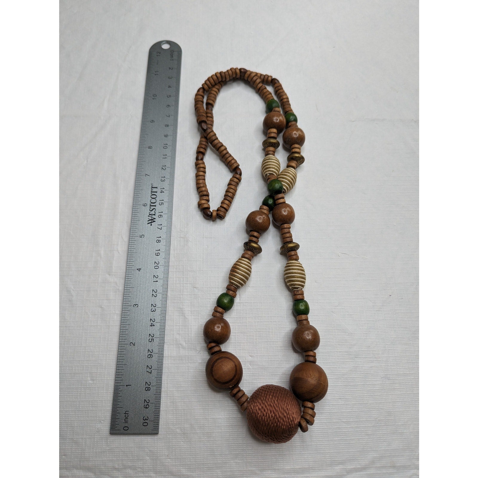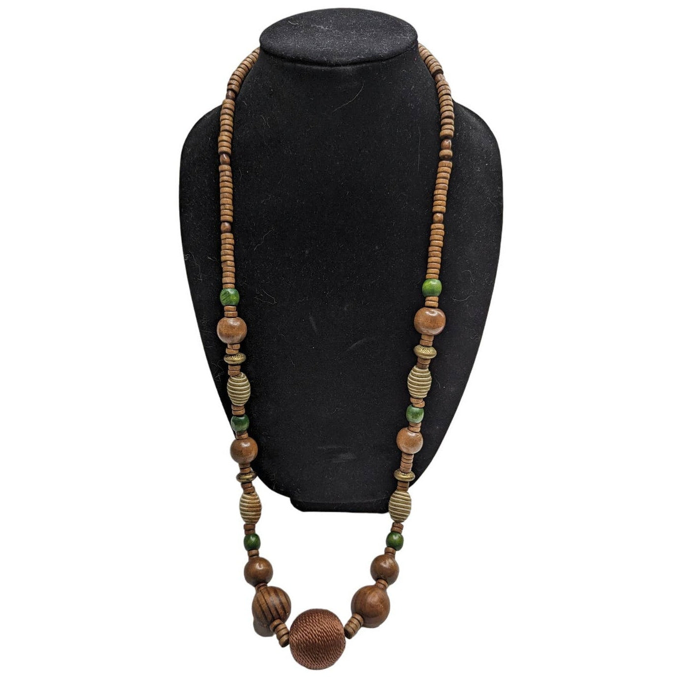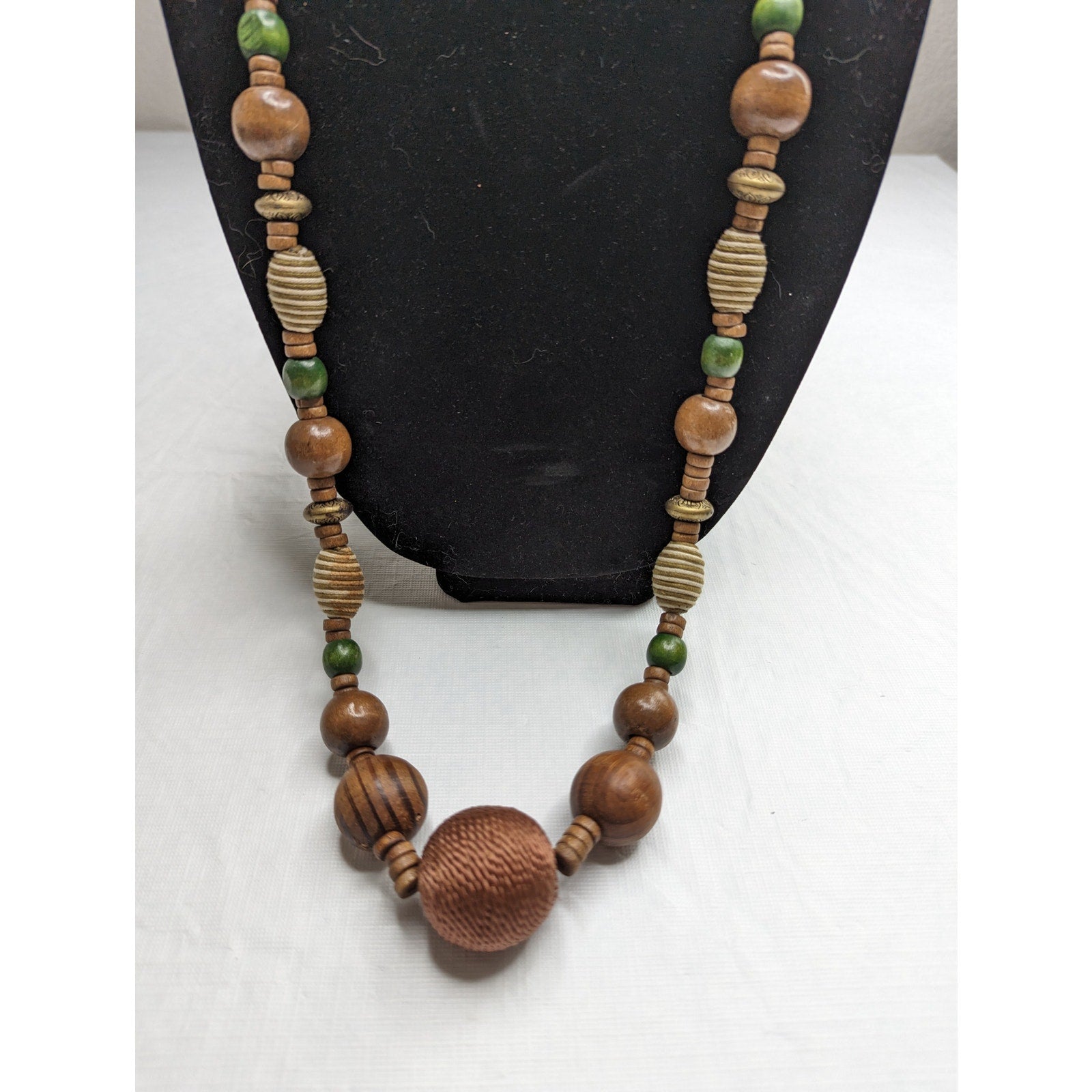 Vintage Mid Century Graduated Single Strand Beaded Necklace Wooden Brown Green