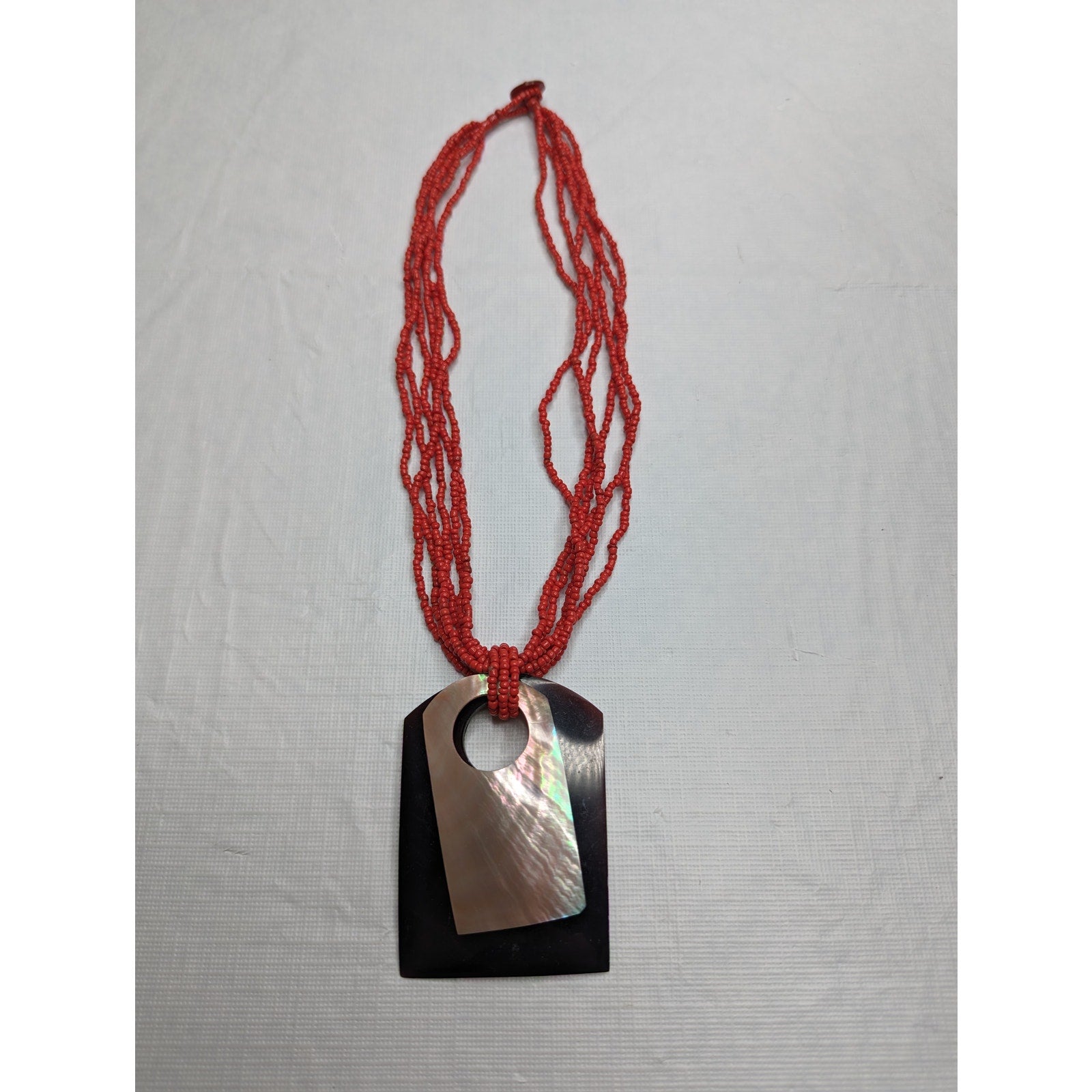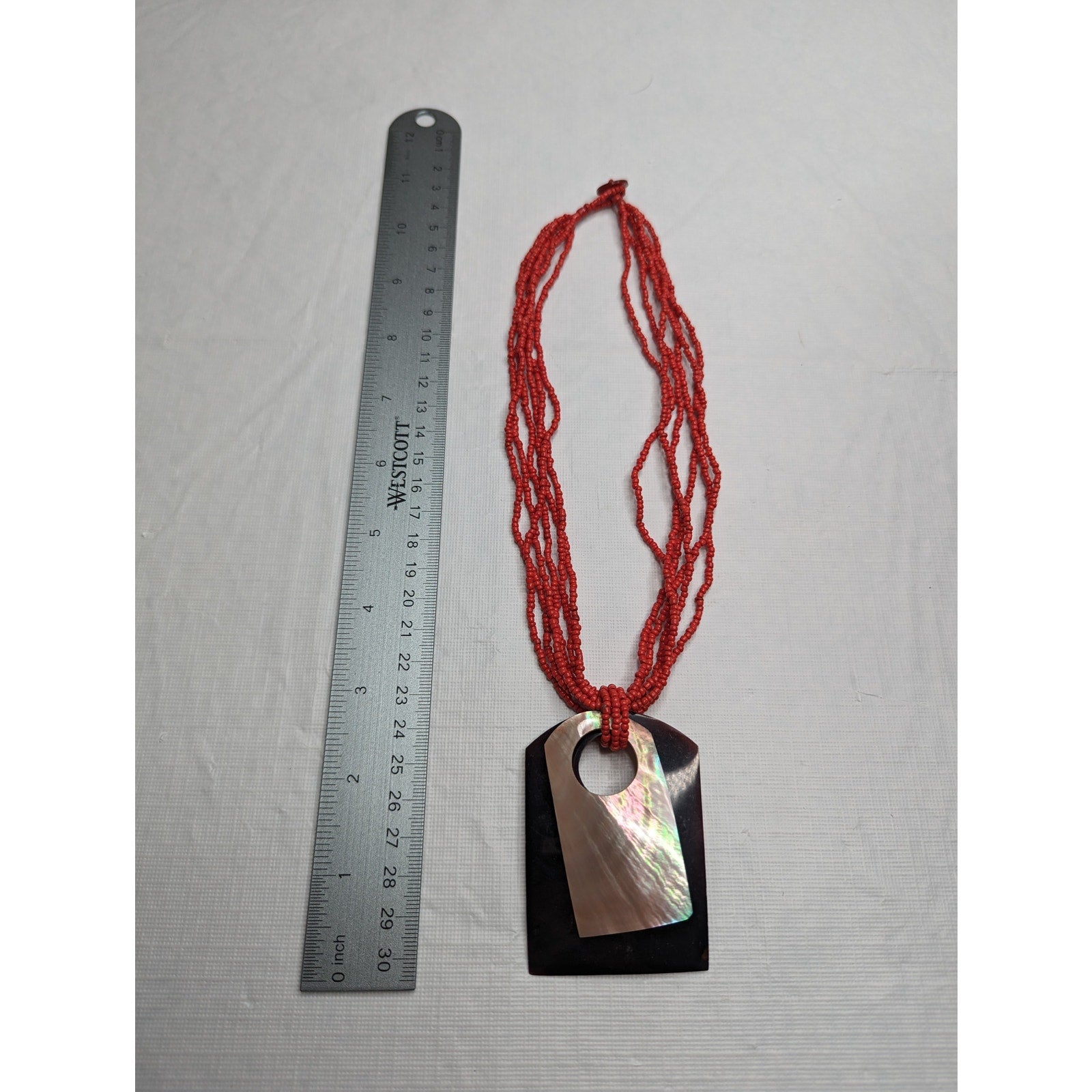 Vintage Mid Century Multi Strand Seed Bead Pendant Necklace Black Red