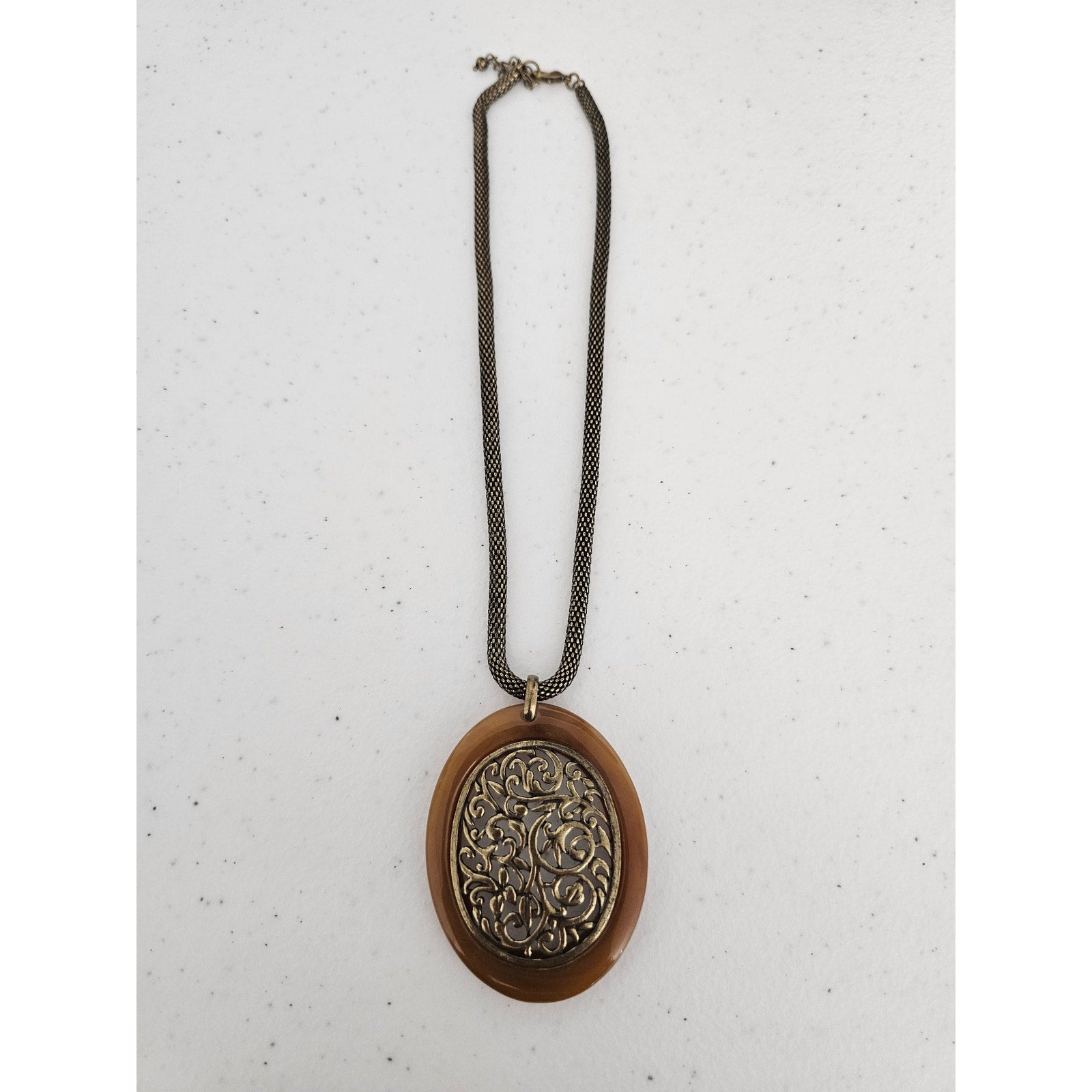 Vintage Mid Century Pendant Style Necklace Dark Gold Filigree Oval Stone