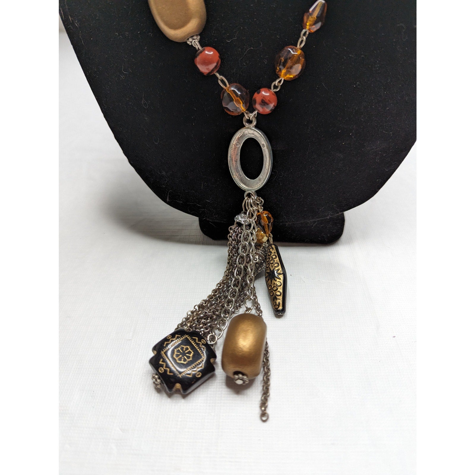 Vintage Mid Century Single Strand Pendant Beaded Necklace Aztec Stones
