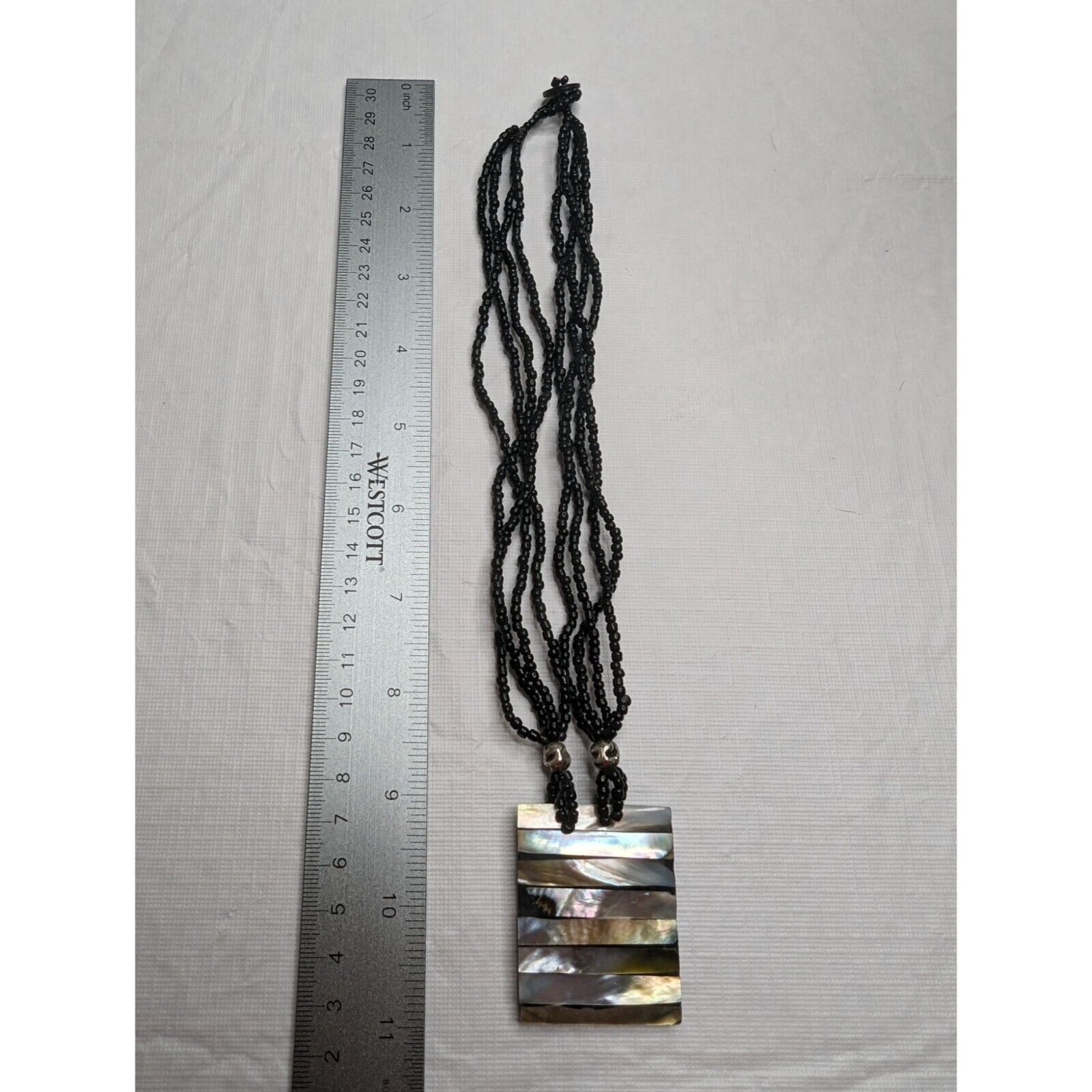 Vintage Multi Strand Beaded Necklace Rectangle Shell Pendant Black Pink