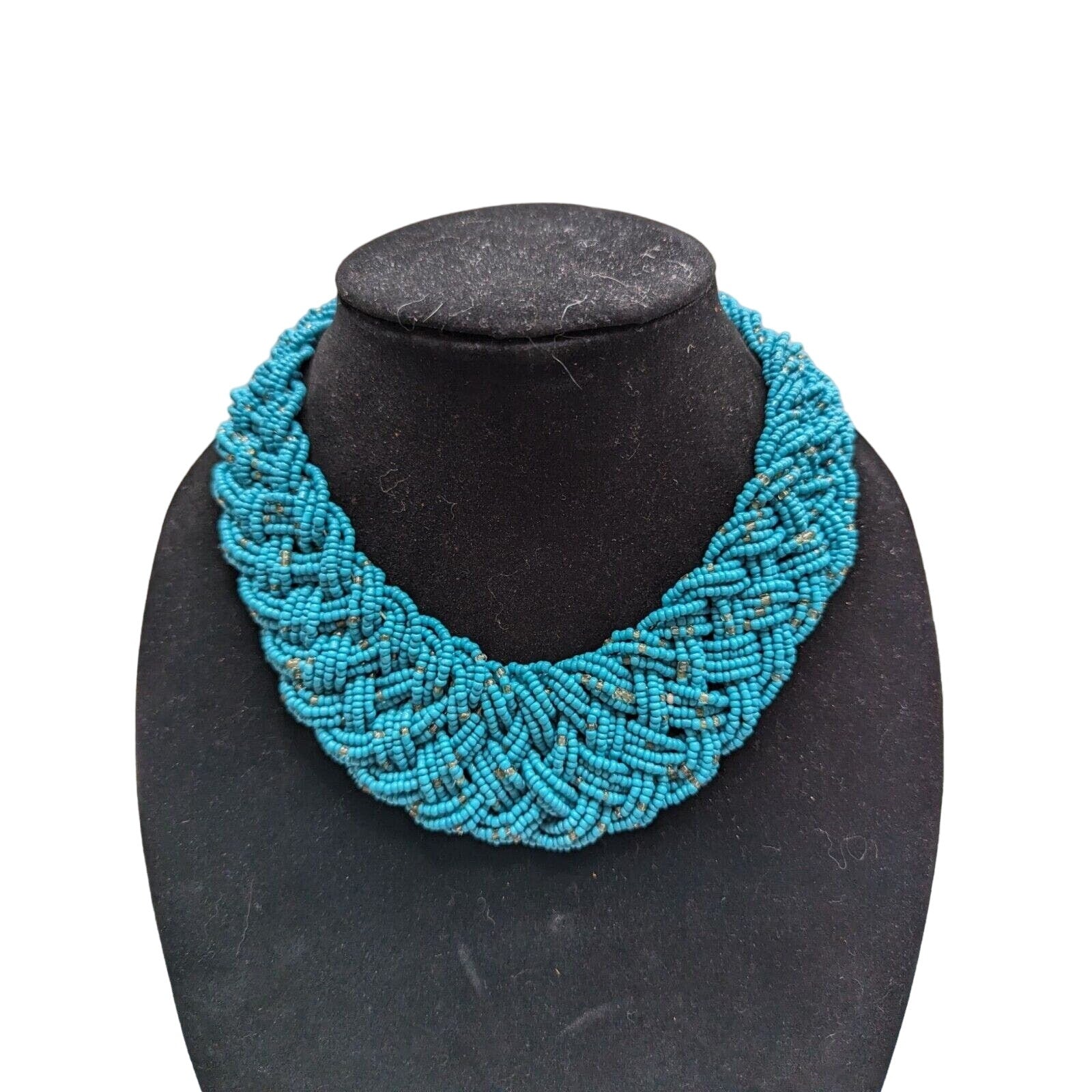 Vintage Multi Strand Braided Seed Bead Collar Statement Necklace Blue