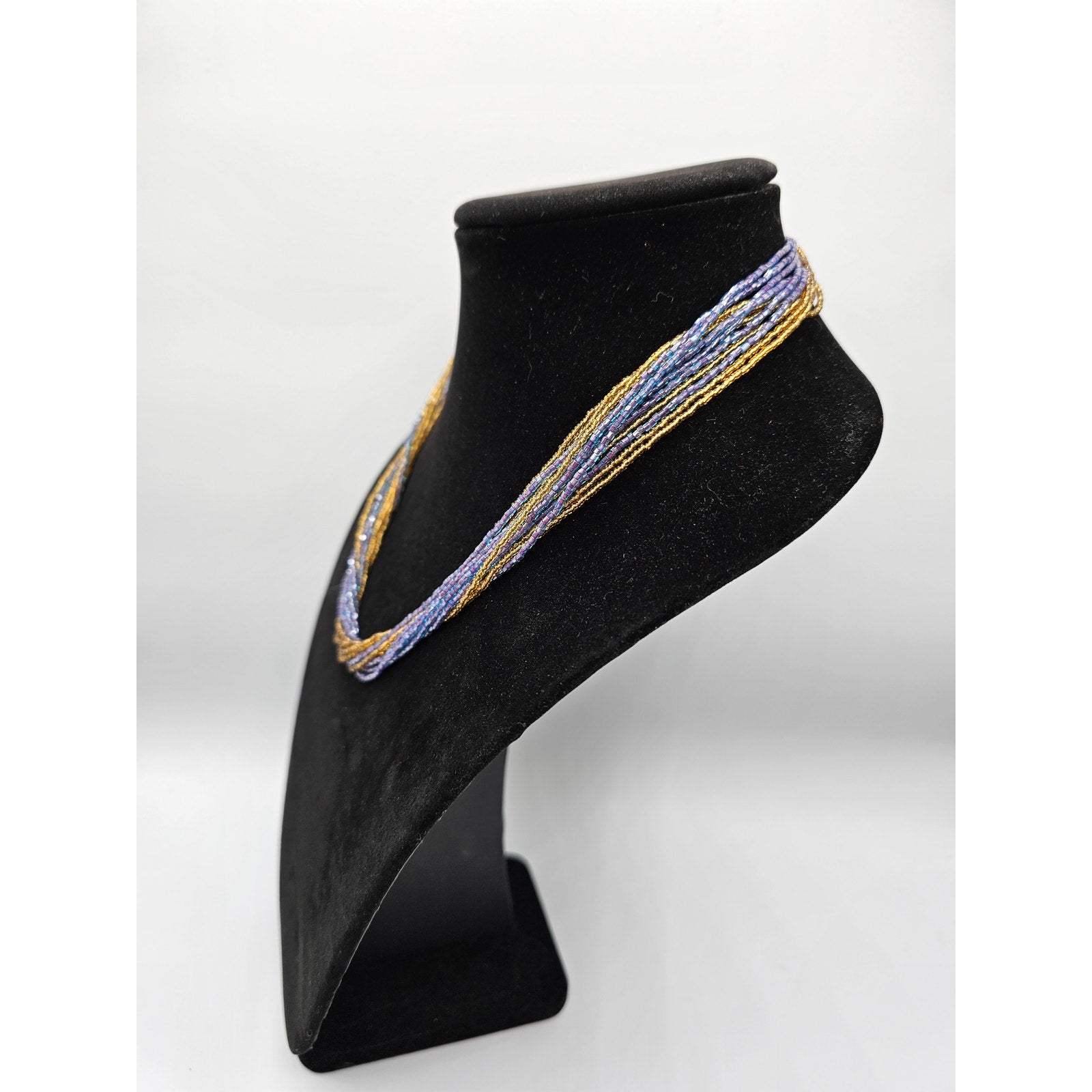 Vintage Multi Strand Seed Bead Necklace Gold and Blue 1980s
