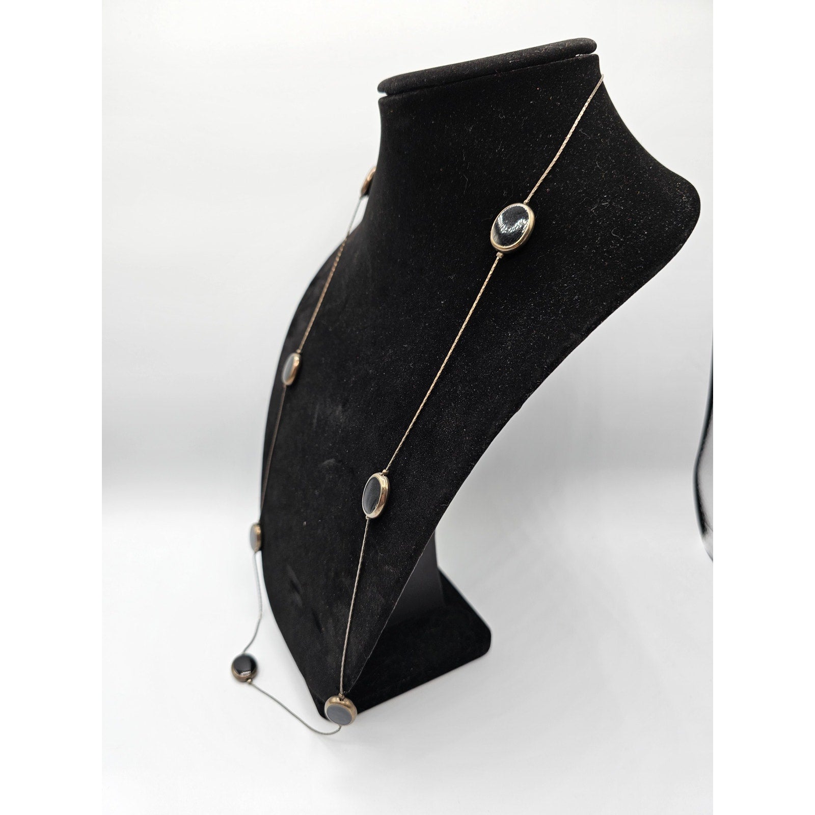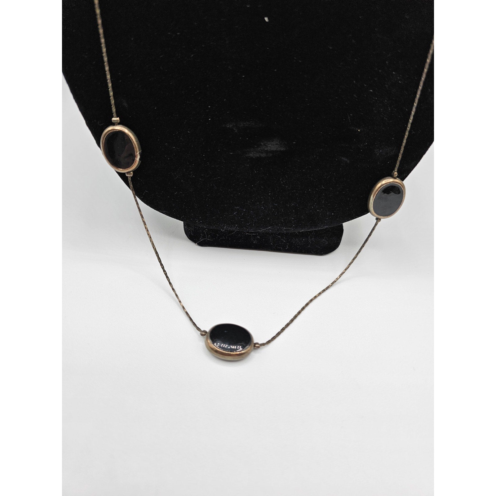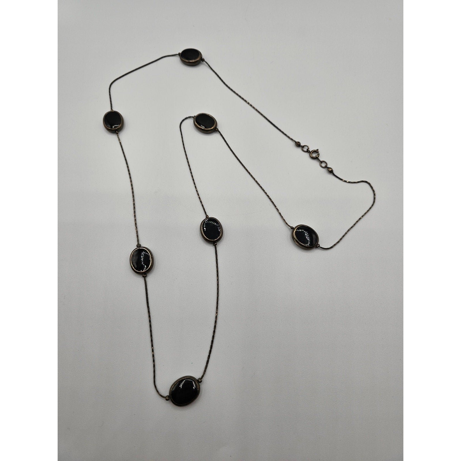 Vintage Silver Tone Long Strand Necklace Dainty Black Stone Accents