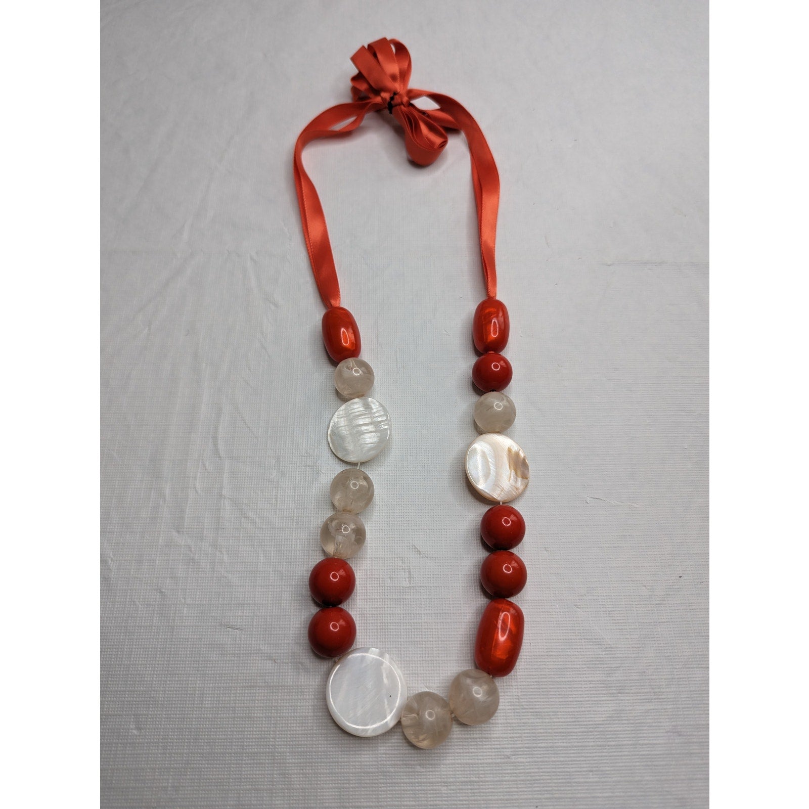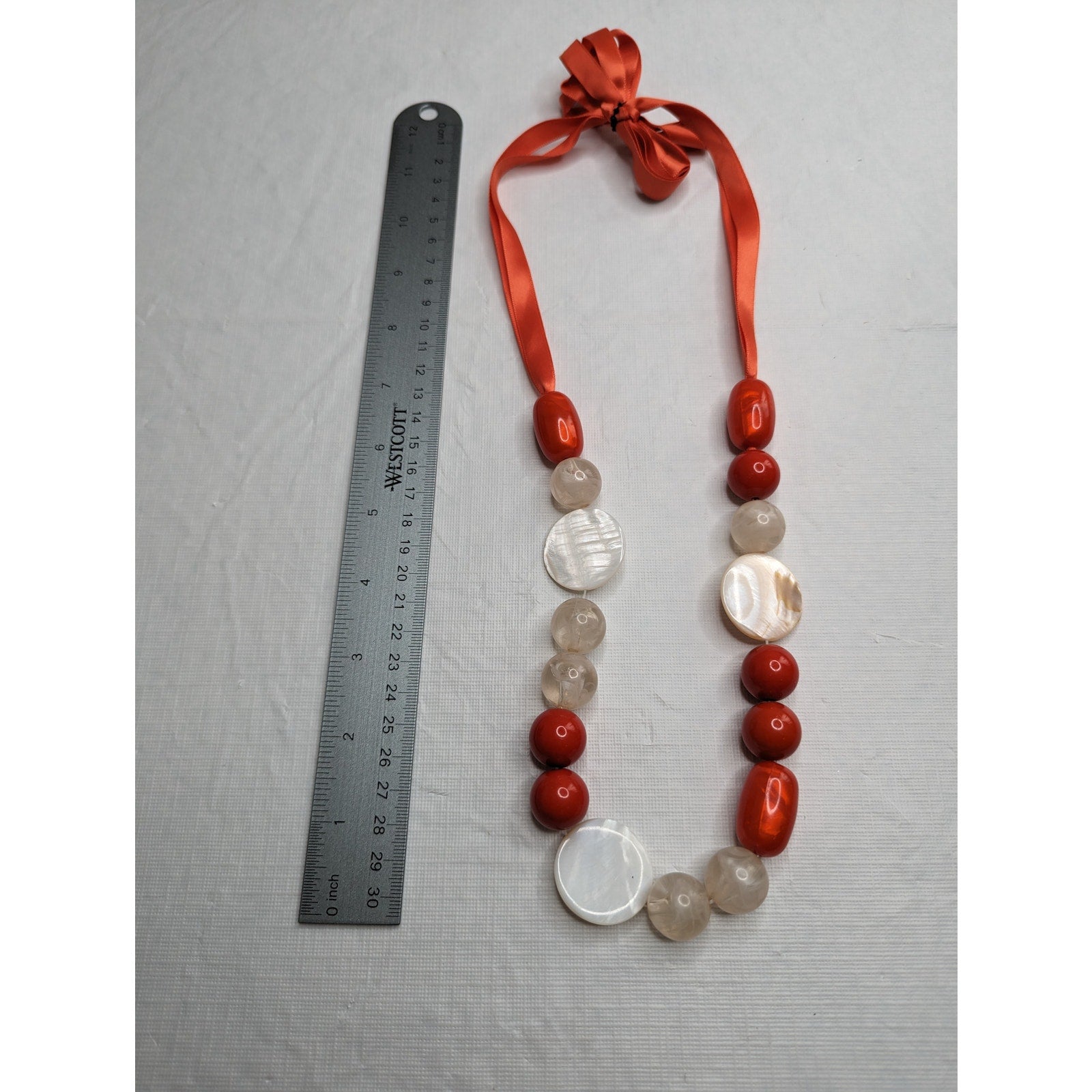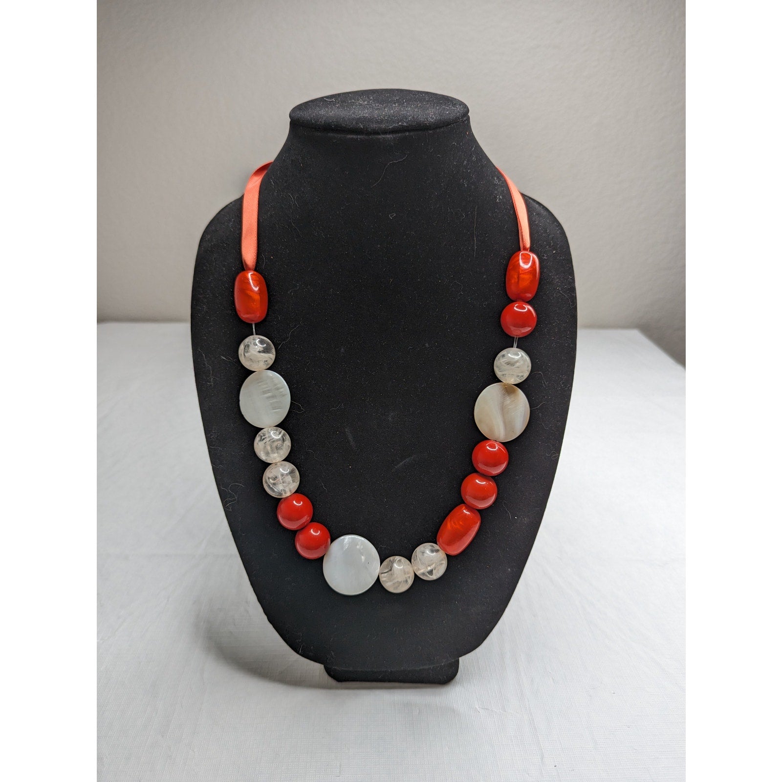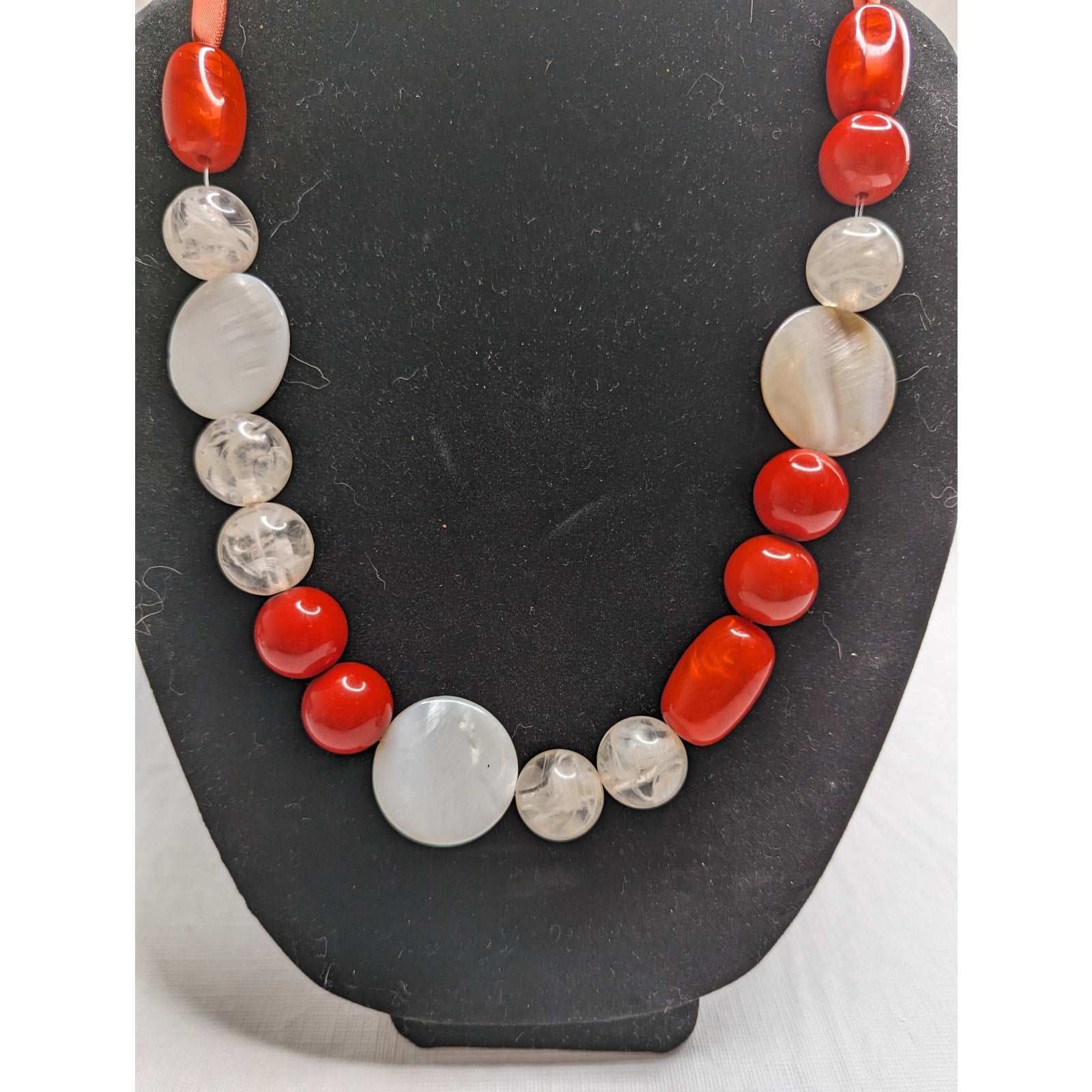 Vintage Single Strand Ribbon Glass Beaded Necklace Red White Beads