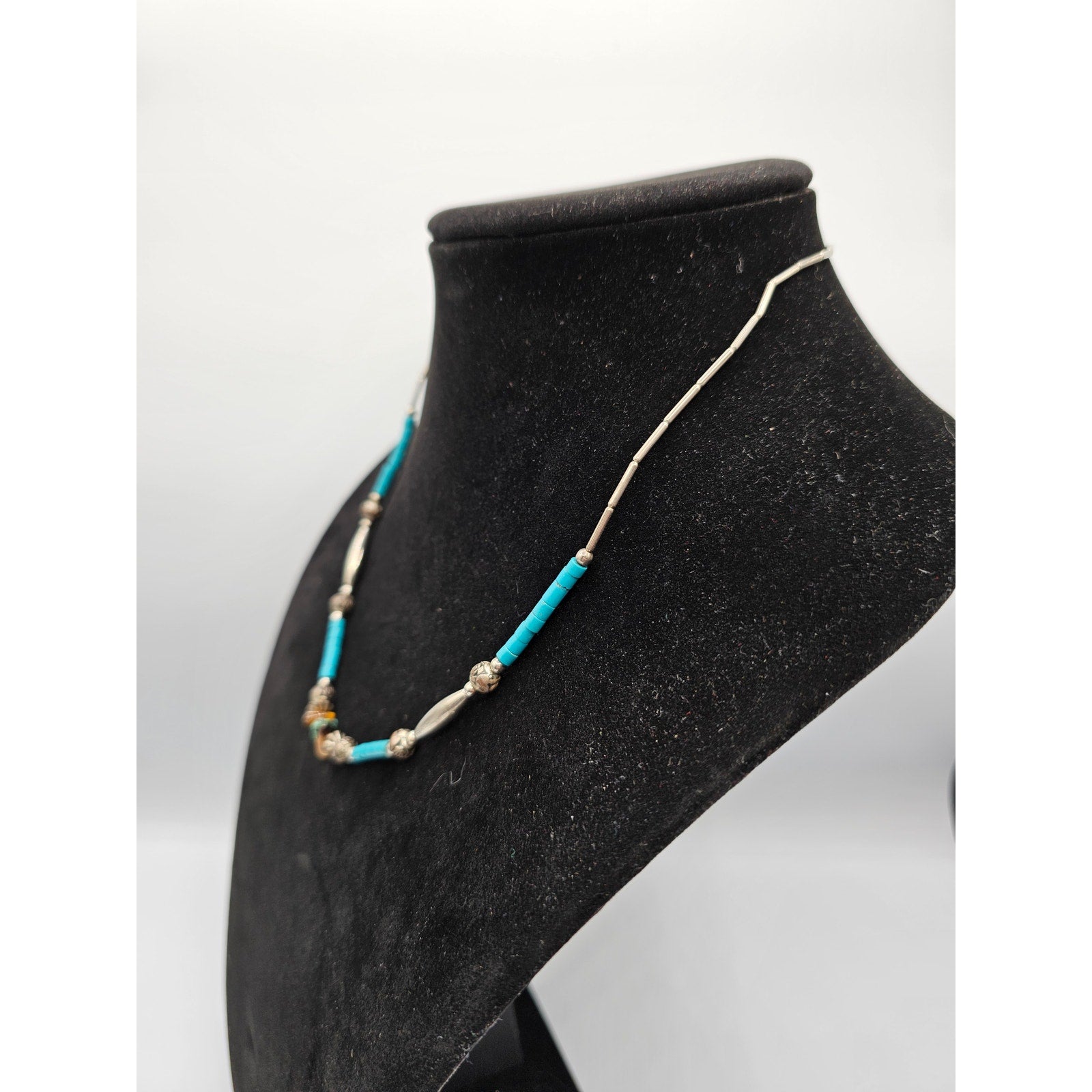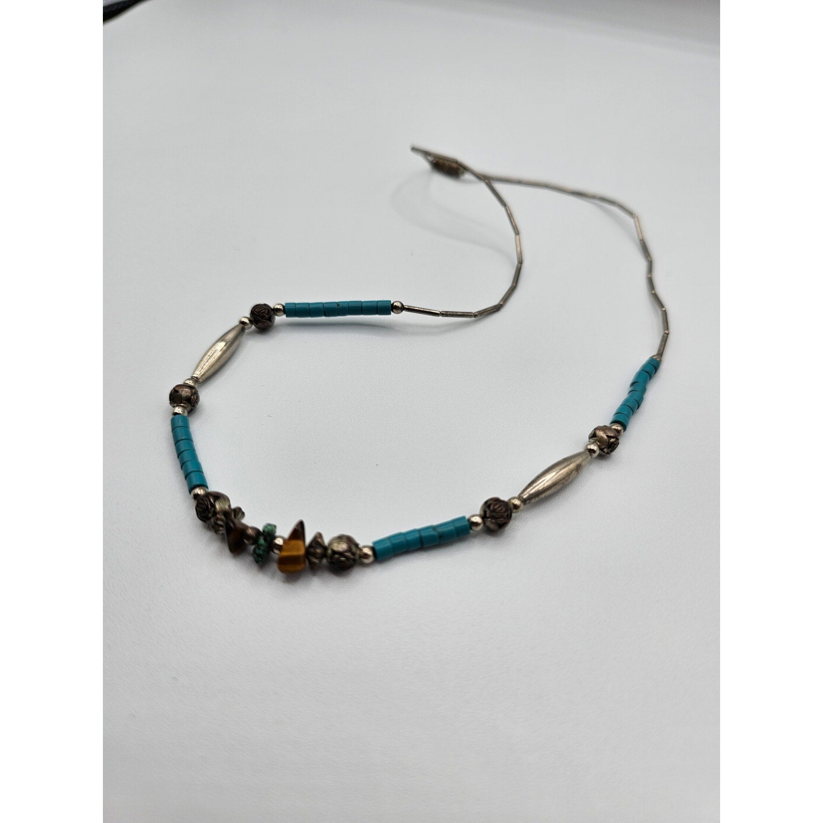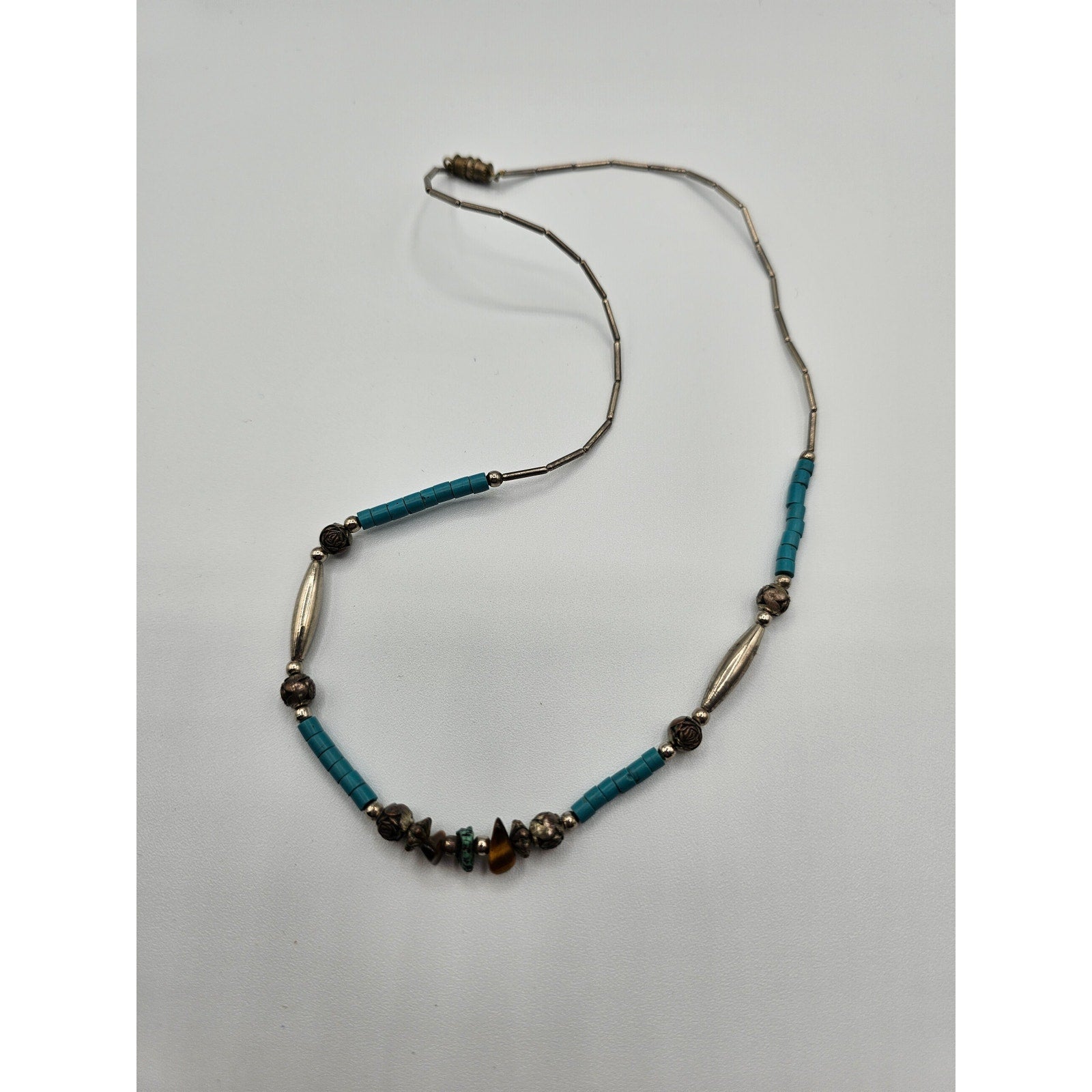 This vintage Southwestern style single strand necklace features a beautiful combination of teal and silver tones. The unique design and intricate details make it a great addition to any jewelry collection. The necklace is perfect for adding a pop of color to any outfit and is sure to catch the eye of anyone who sees it. Made with high-quality materials, this necklace is built to last and can be enjoyed for years to come.