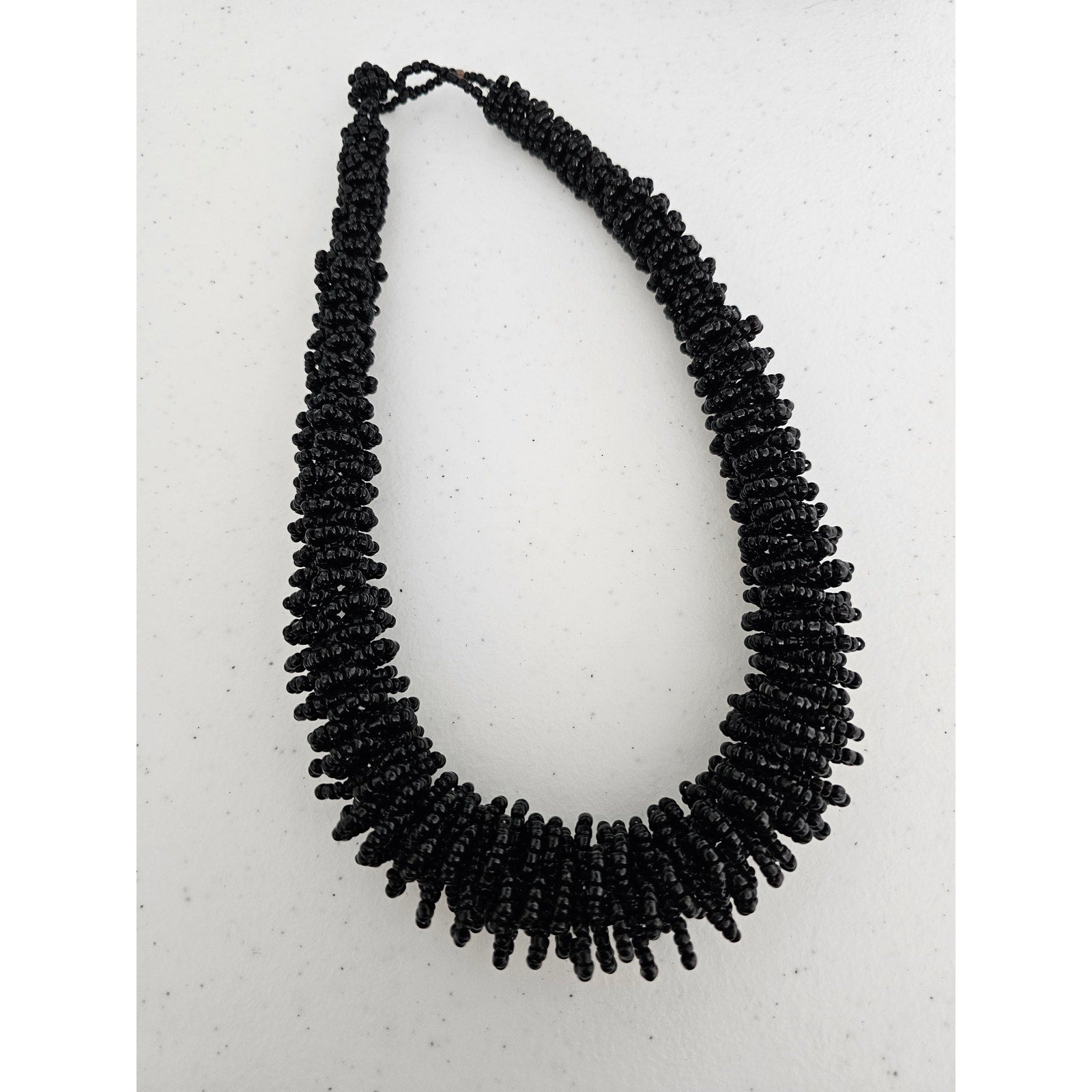 This vintage statement piece is a stunning addition to any jewelry collection. The black seed beads are intricately stacked to create a beautiful and unique necklace. The style is beaded and the color is black. This necklace is perfect for those who love handcrafted and artisan jewelry. It is a one-of-a-kind piece that will make a bold statement with any outfit. Whether you're going to a formal event or just out running errands, this necklace is sure to turn heads.