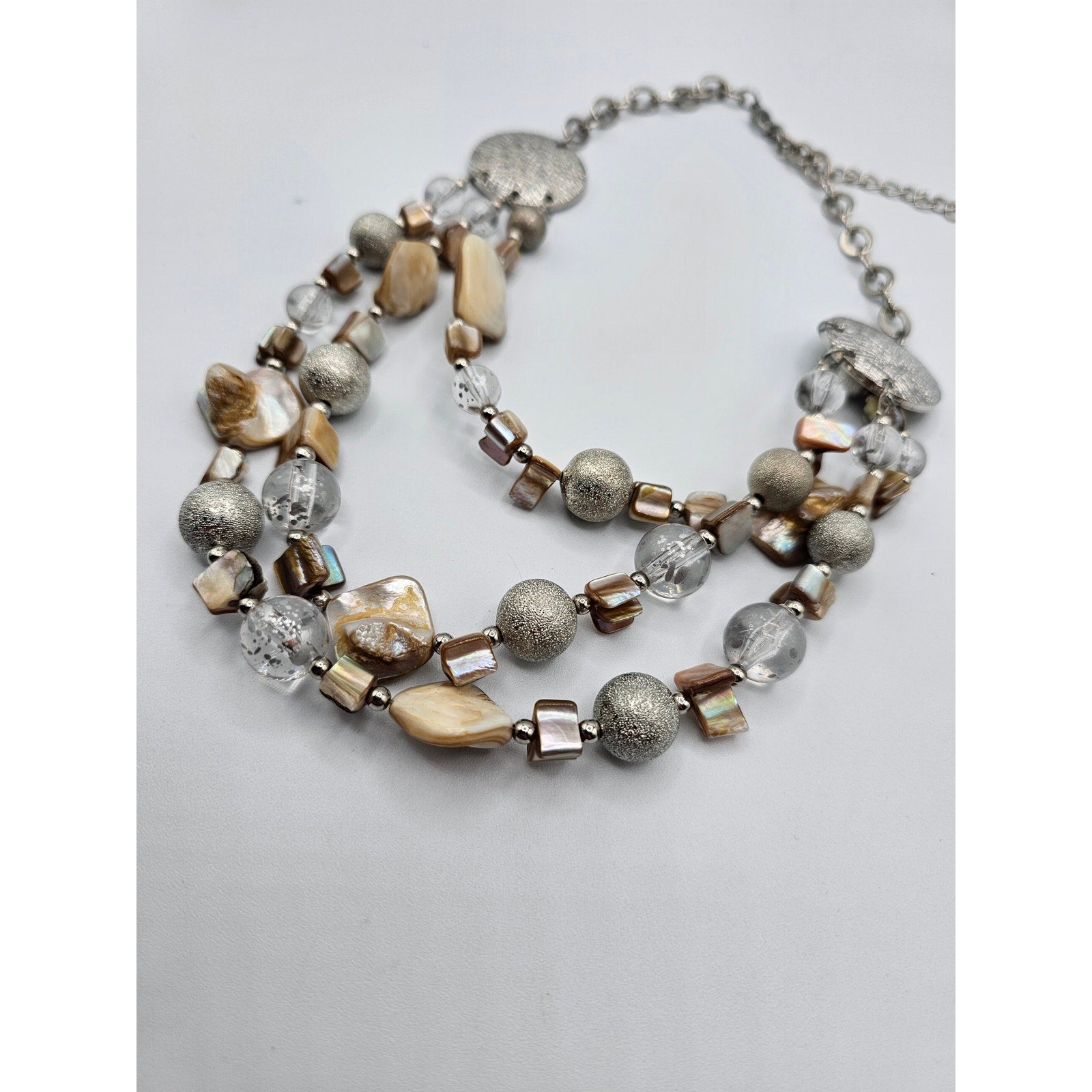 This vintage necklace is a true statement piece, with its multi-strand design and beautiful stone beads. The cream and silver color scheme adds a touch of elegance to any outfit. Perfect for those who love unique and eye-catching accessories. Crafted with care, this necklace is sure to become a treasured addition to any collection. Its vintage charm and timeless design make it a versatile piece that can be worn with any outfit. Add a touch of sophistication to your style with this beautiful necklace.