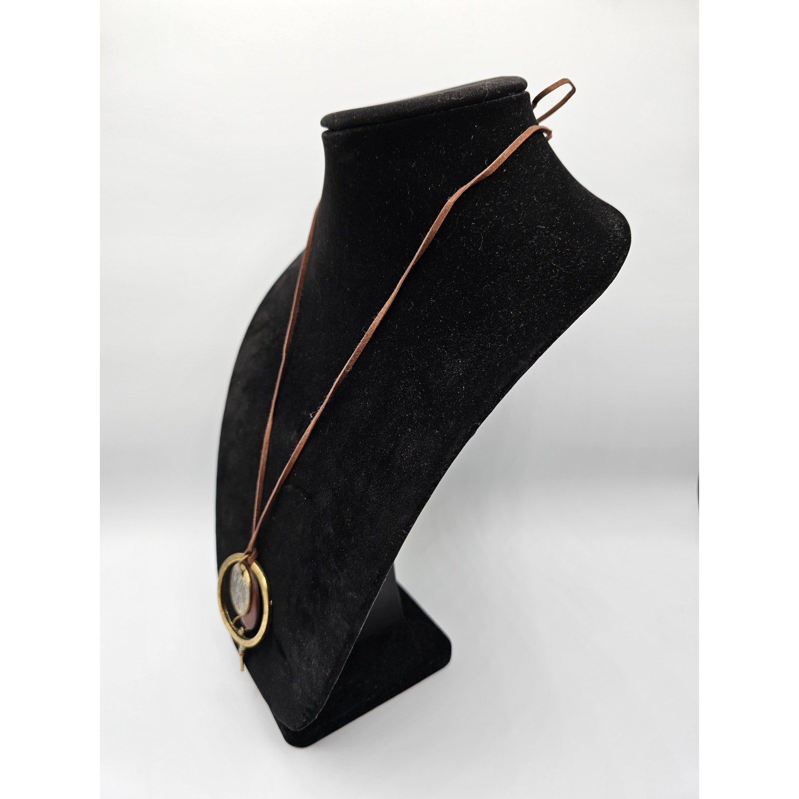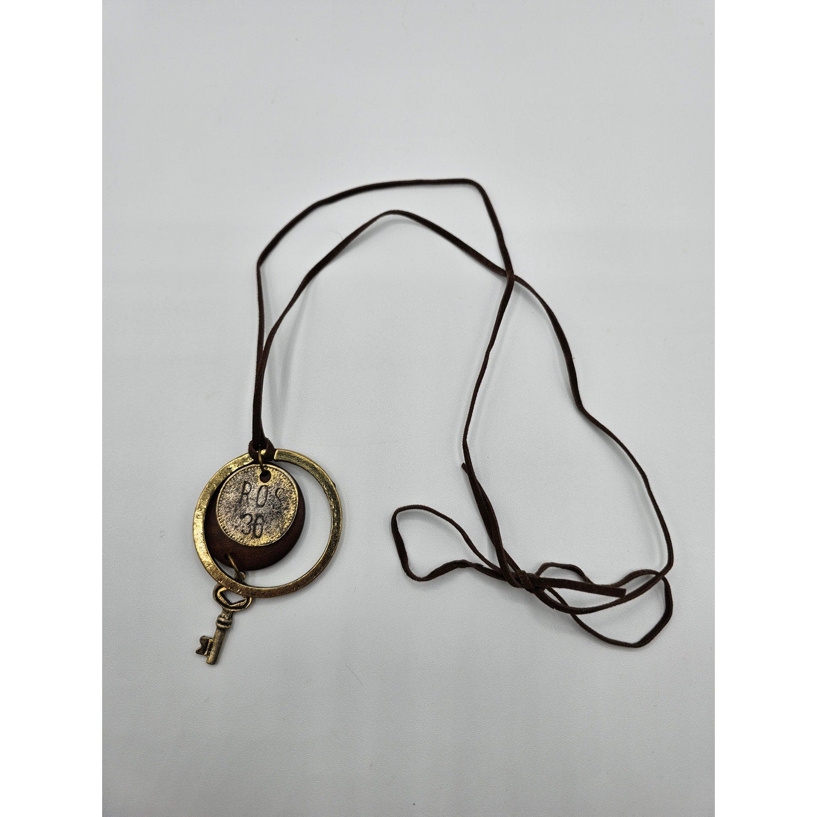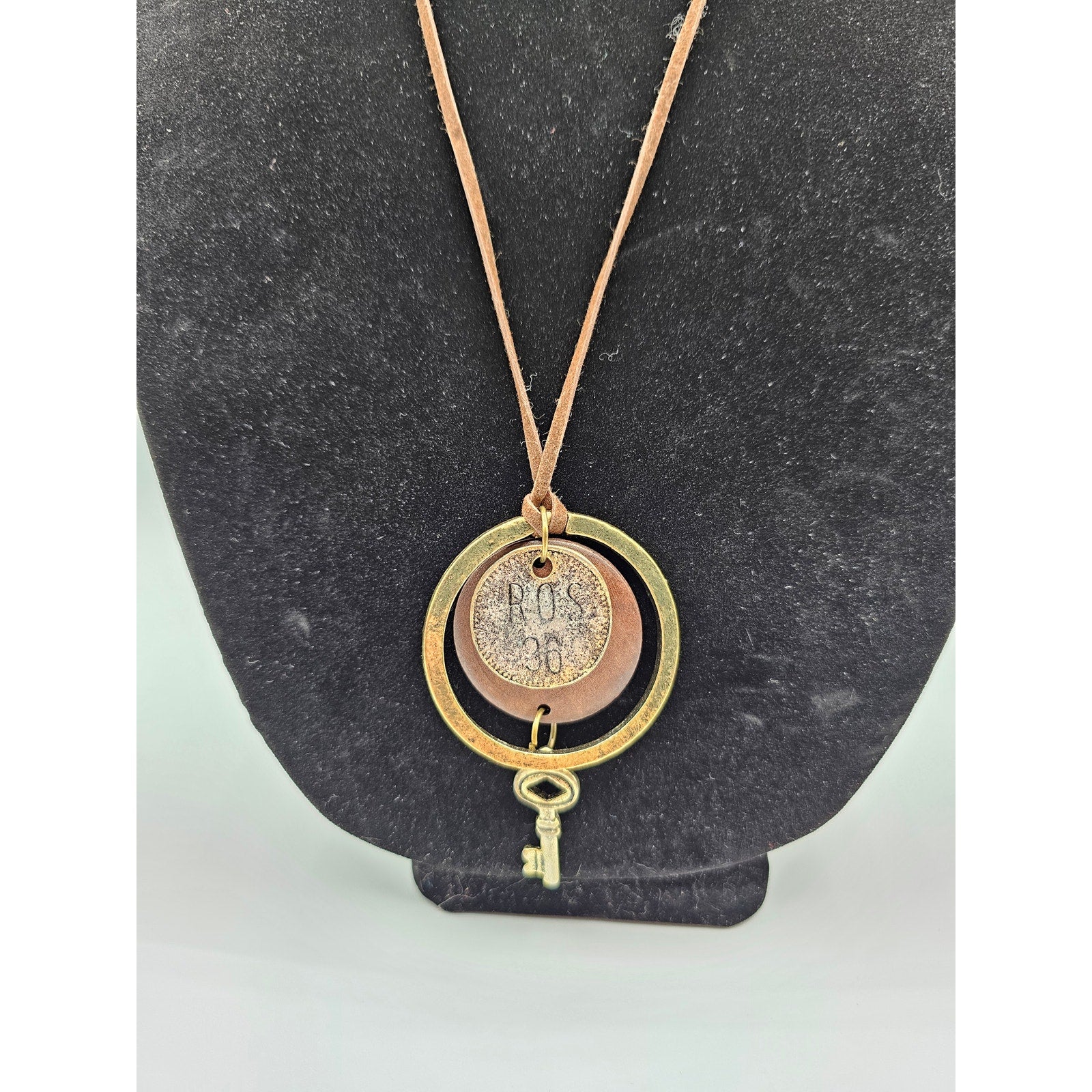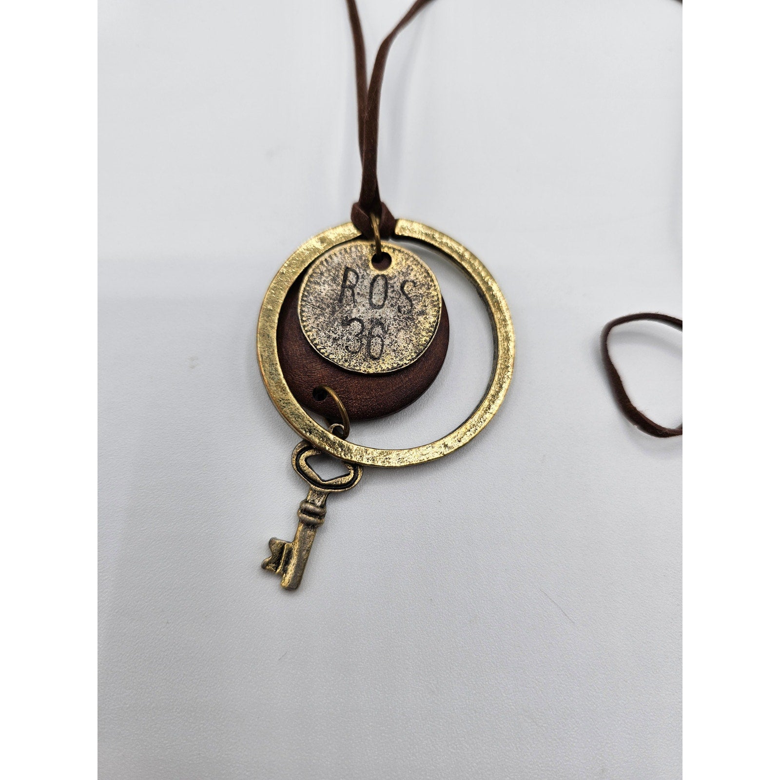 This vintage steampunk pendant necklace is a stunning addition to any collection. The unique design features a skeleton key pendant on a leather strap with brass and gold tone accents. The necklace is perfect for those who love antiques and vintage jewelry. The necklace is a great conversation piece and would make a wonderful gift for a loved one. The combination of the leather strap and the unique pendant make this necklace a must-have for any steampunk or vintage jewelry enthusiast. Add it to your collection today!