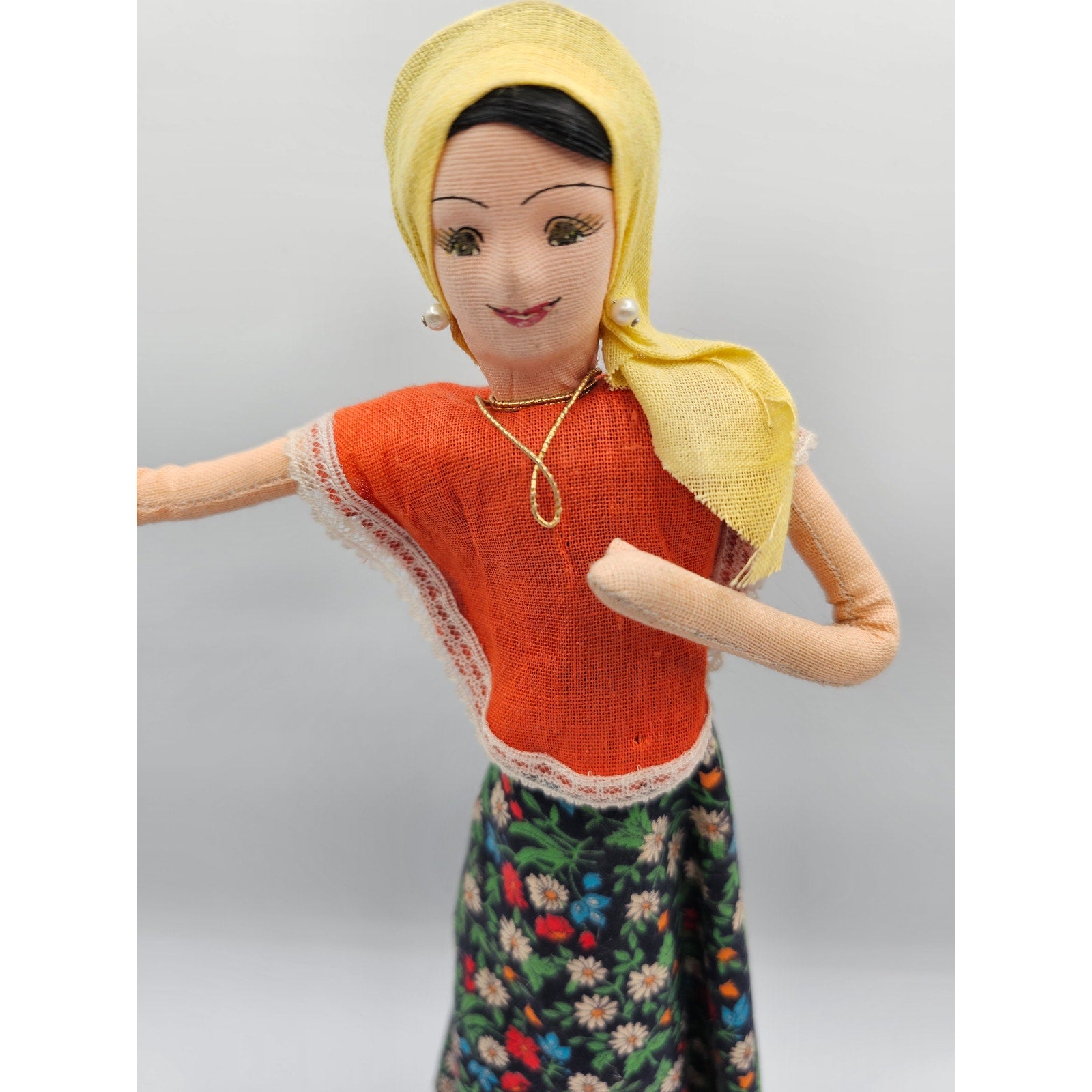 This vintage Turkish bridal doll is a beautiful addition to any collection. With poseable arms and a wooden stand, this doll is perfect for display. The floral skirt adds a pop of color and elegance to the overall design. A unique find for antique lovers, this doll is sure to impress.