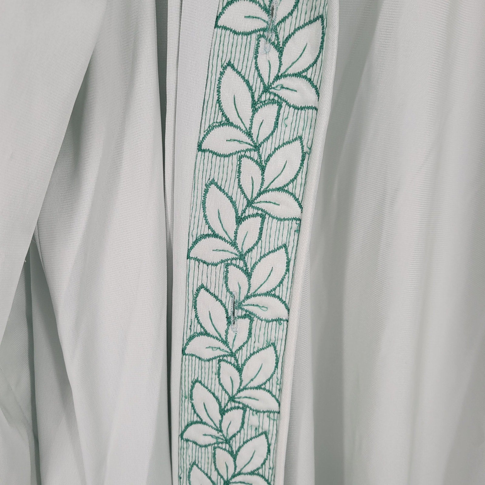 This vintage Vanity Fair house dress robe is a stunning addition to any antique collection. The light green nylon fabric is soft and delicate, while the trim details add a touch of elegance. The dress is perfect for any occasion, whether it's a formal event or a casual day out. The dress is available in size L and is suitable for any woman's wardrobe. The Antron III House Dress Robe is a must-have for collectors of vintage clothing. Don't miss out on the chance to add this beautiful piece to your collection.