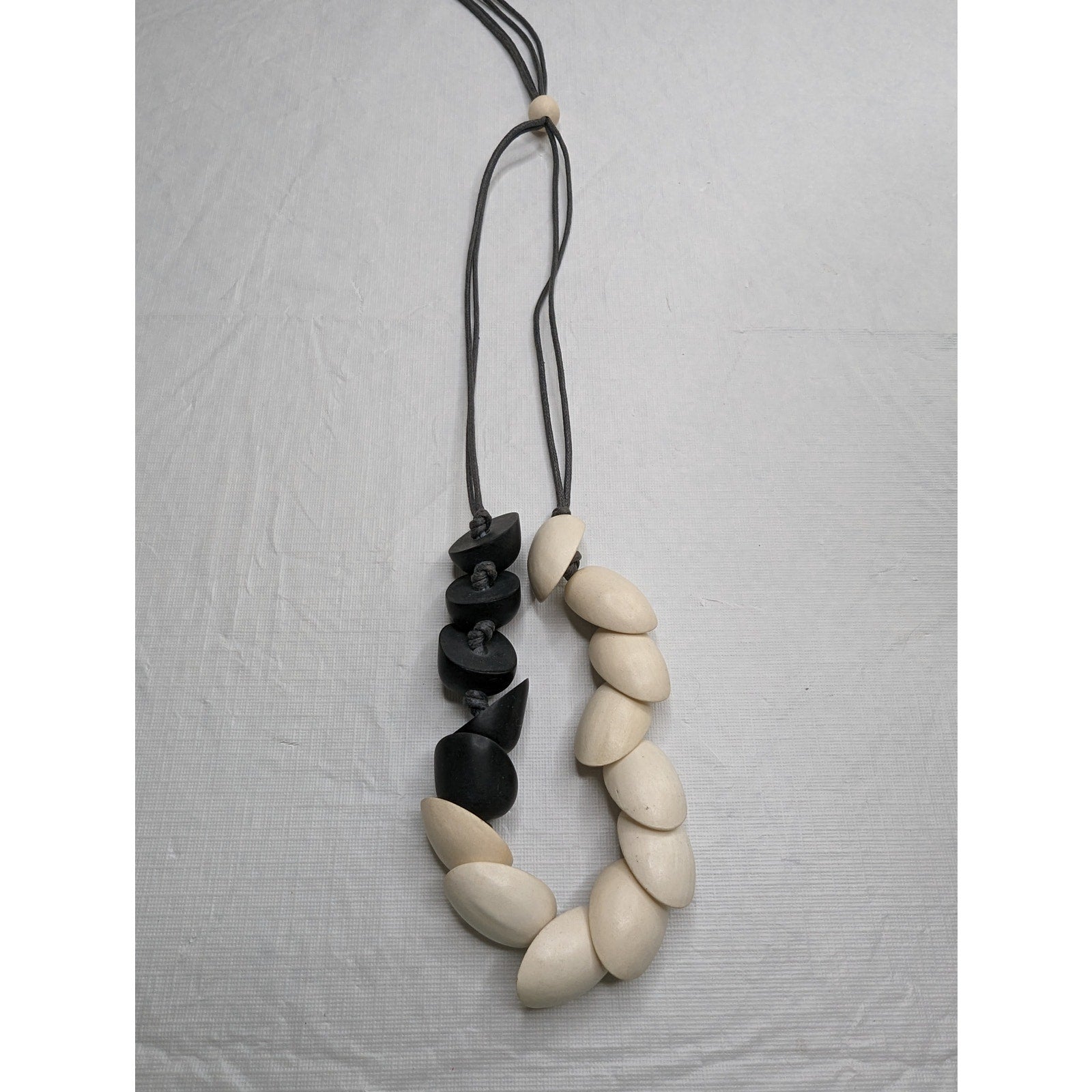 Vintage Wooden Shell Style Leather Rope Beaded Necklace Gray Ivory