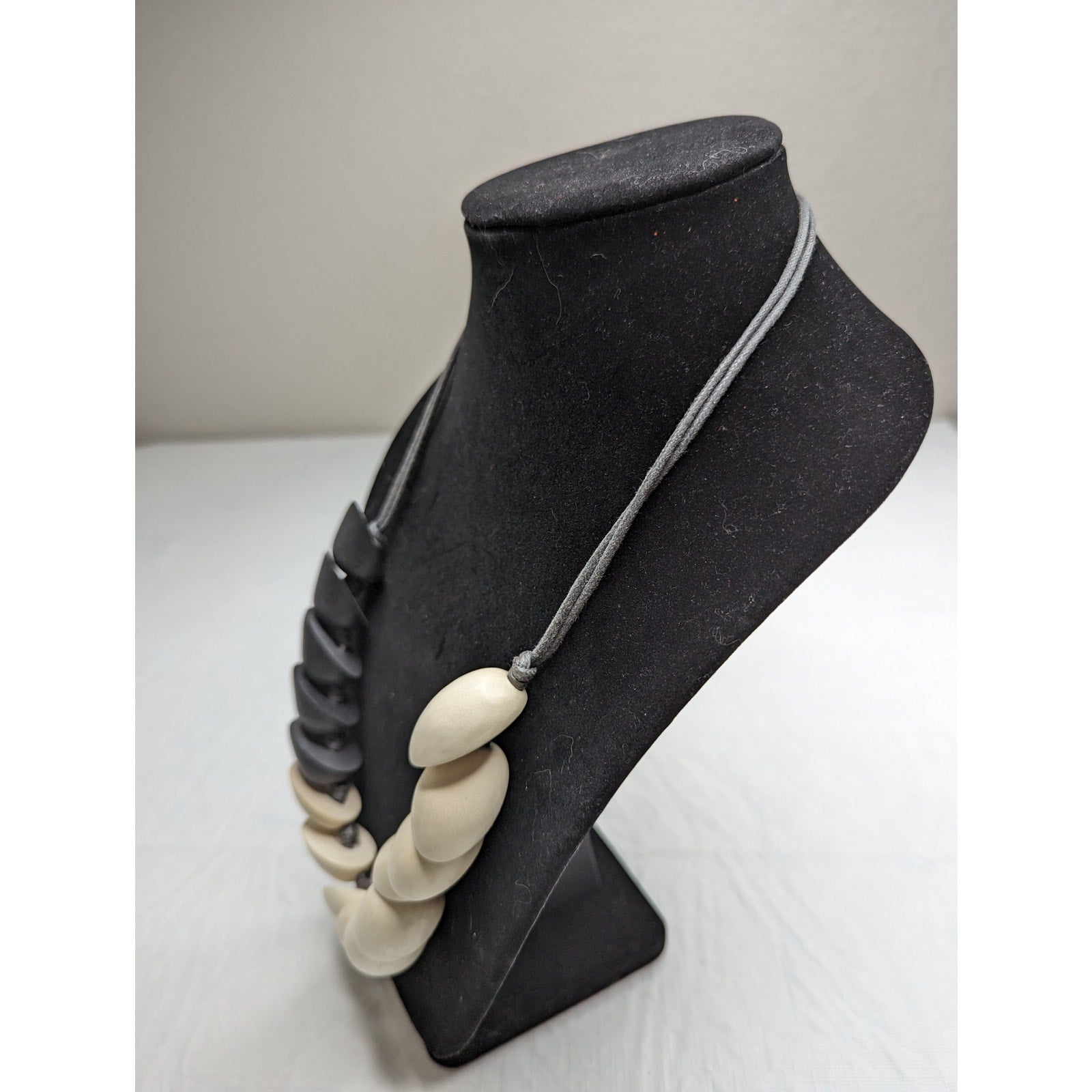 This vintage wooden necklace has a unique shell style design with a gray and ivory color scheme. The leather rope and beaded accents add a charming touch to this antique piece. The necklace is an ideal choice for anyone looking for a stylish addition to their antique jewelry collection.