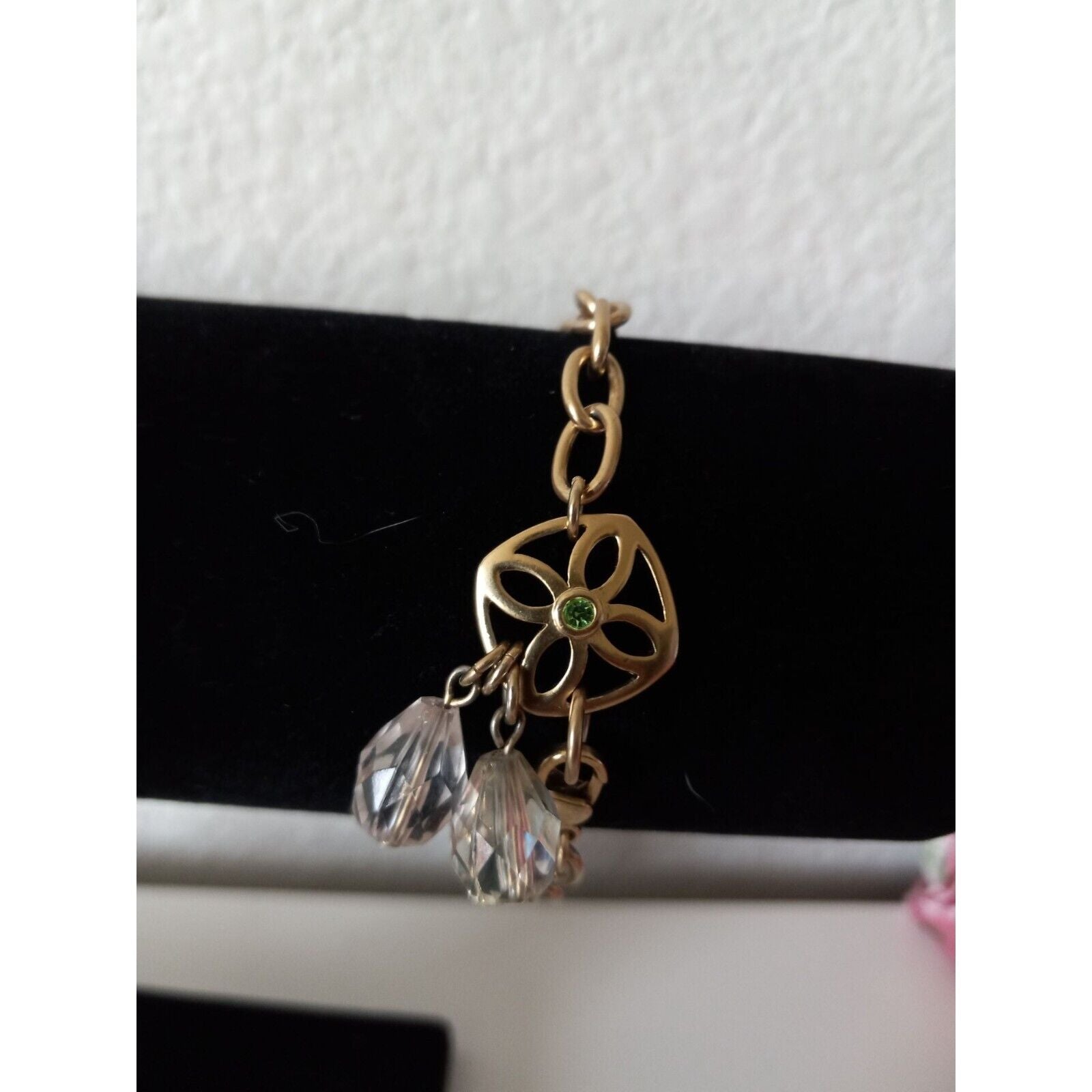 Vintage Y2K Gold Tone Chain Link Bracelet w/ Clear Rhinestone Charms Green Stone