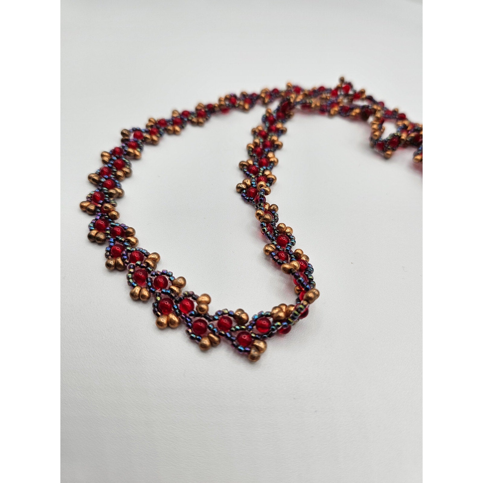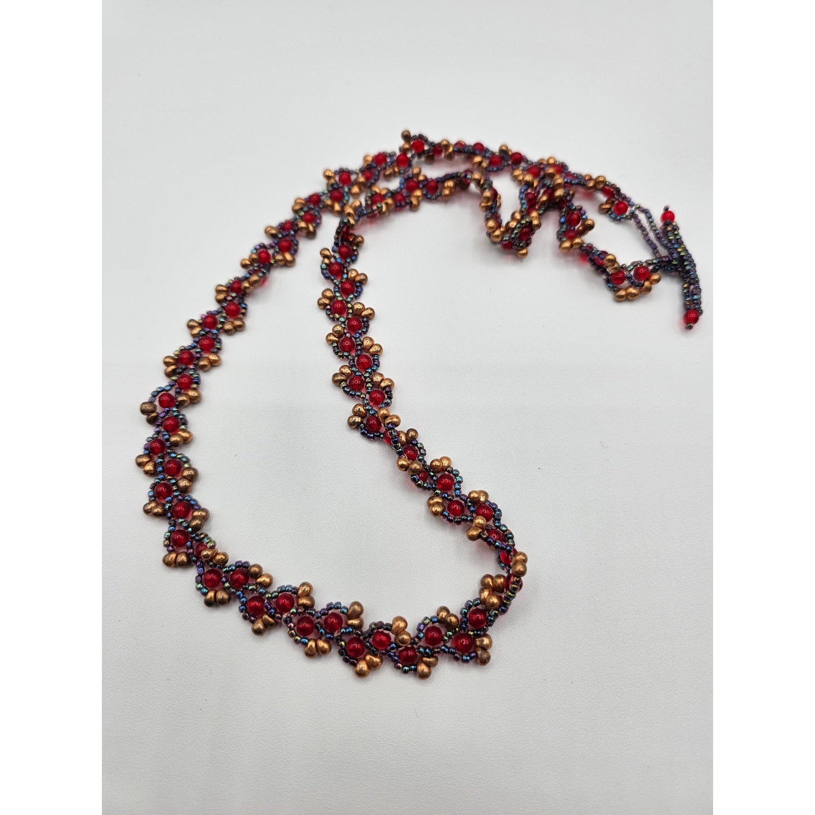 Vintage Y2K Seed Bead and Glass Beaded Braided Necklace Red Purple Gold