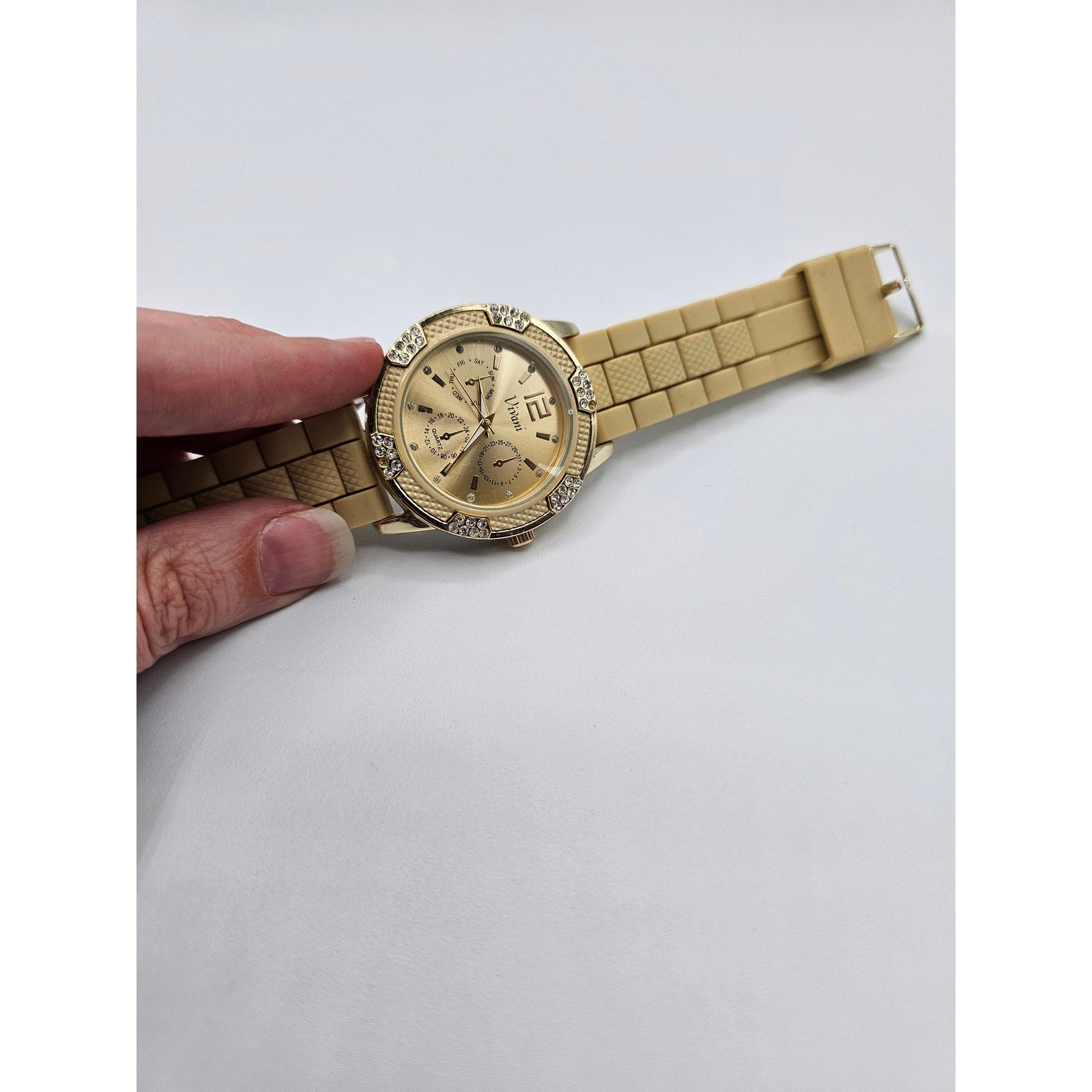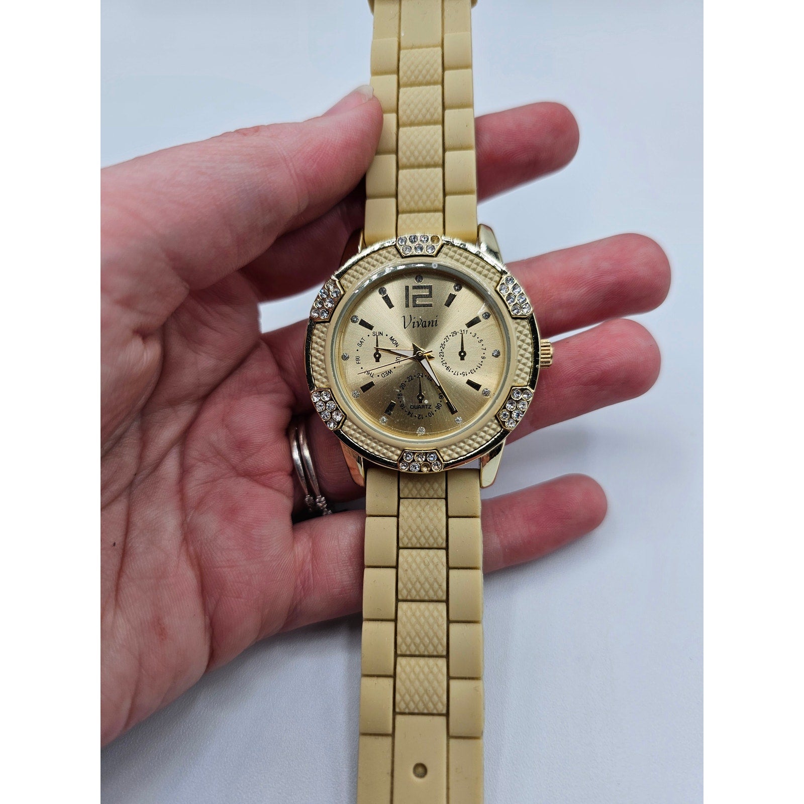 Vintage Y2K Vivani Womens Gold Tone Watch Wristwatch Rubber Band Rhinestone