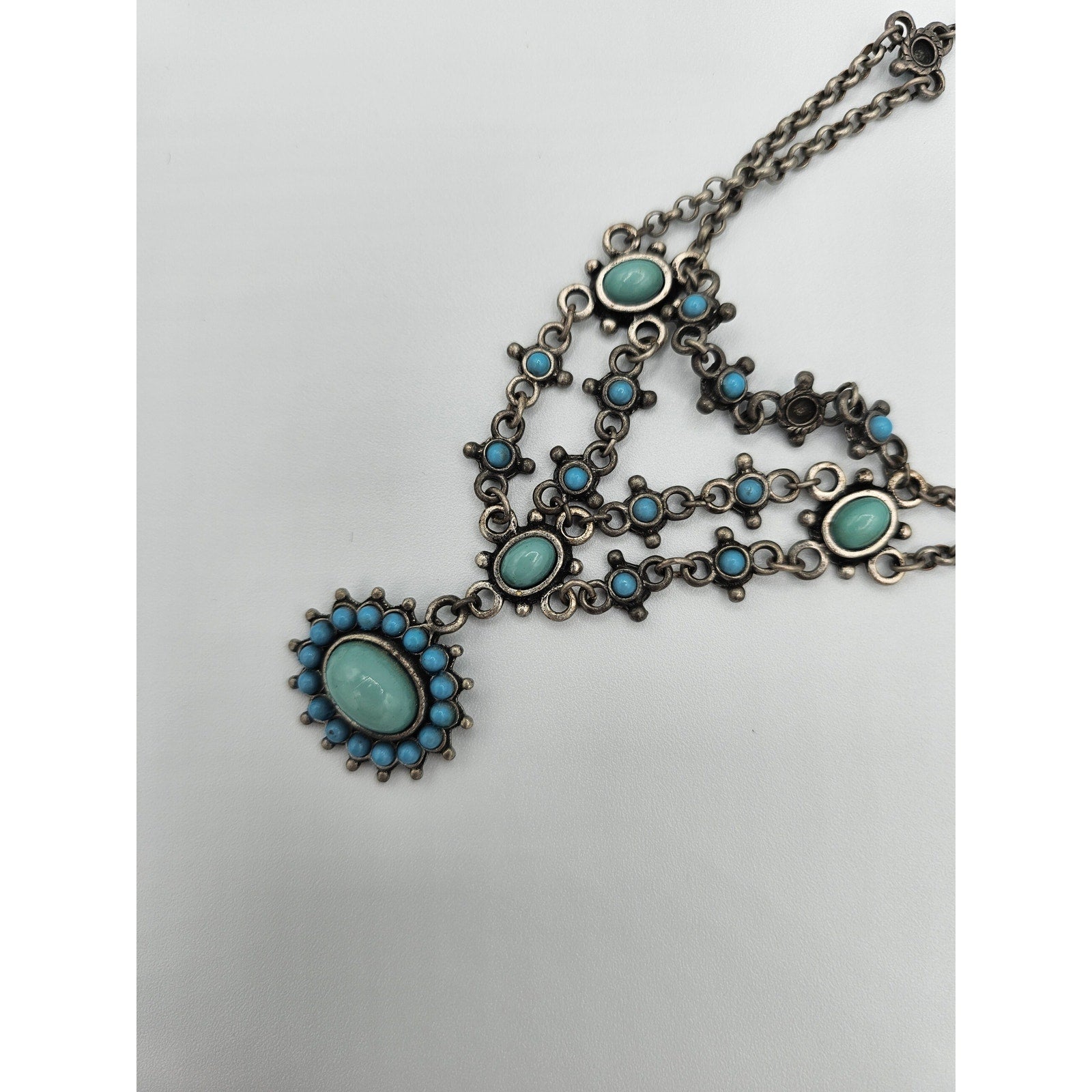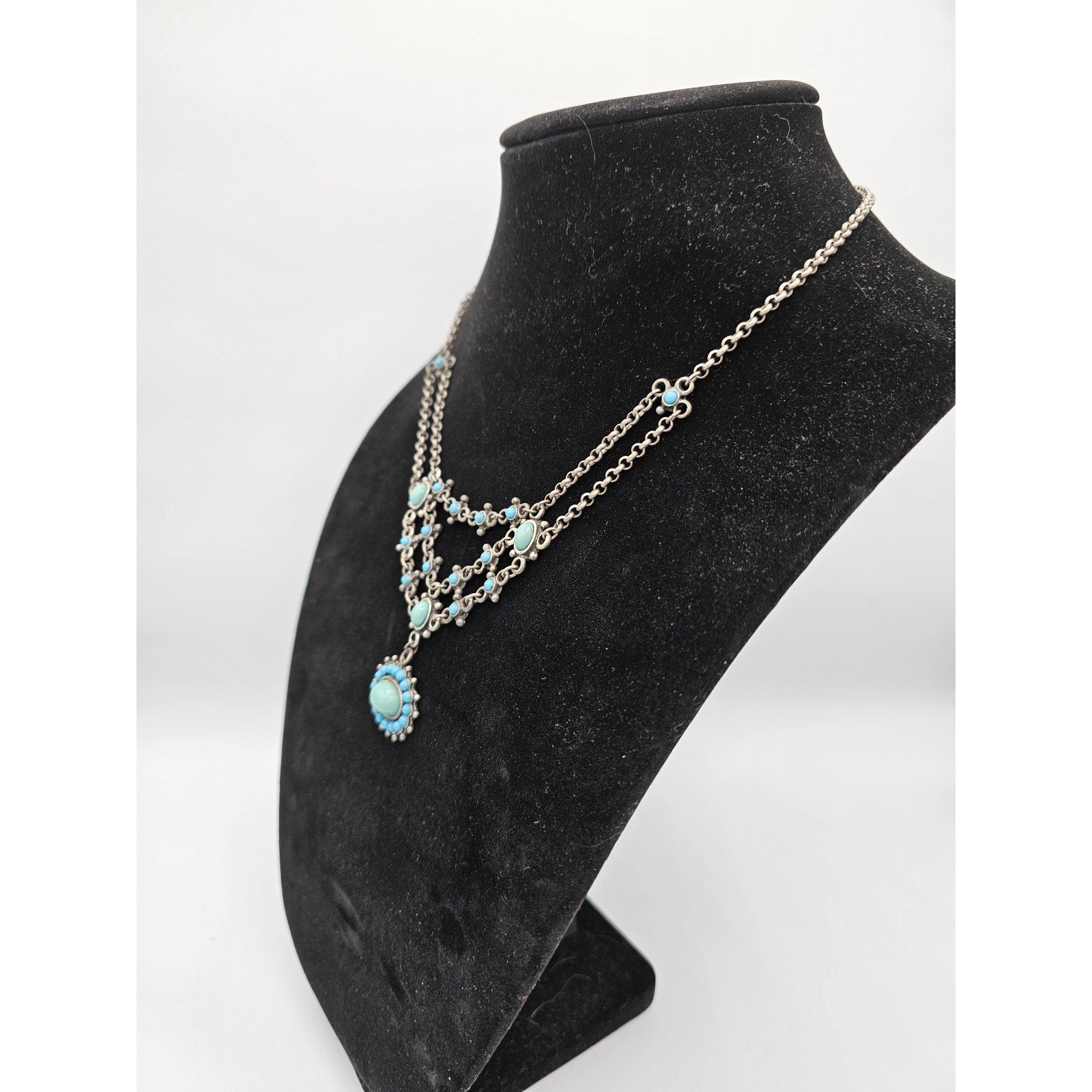 Vintage Y2K Womens Pendant Beaded Necklace Silver Tone and Turquoise Stones