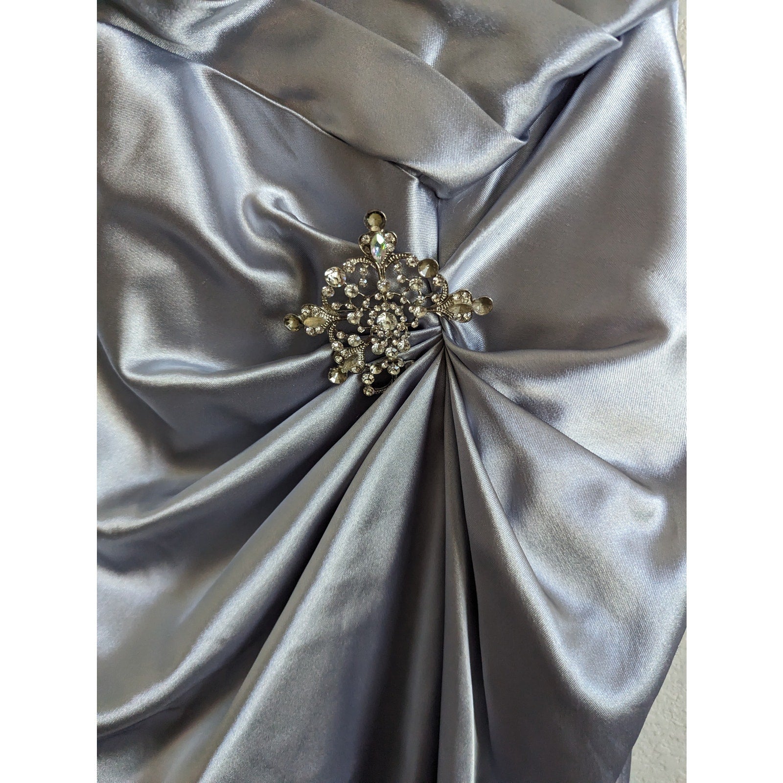 This vintage Y2K women's Aspeed formal dress is a stunning addition to any wardrobe. The ice blue and silver satin fabric create a timeless and elegant look. The strapless maxi design is perfect for formal events, and the size small ensures a flattering fit for any woman. The dress has been lovingly cared for and is in excellent condition, ready to be worn and enjoyed. The intricate detailing and quality craftsmanship make this dress a true treasure. Add this gorgeous piece to your collection or wear it to your next formal occasion.